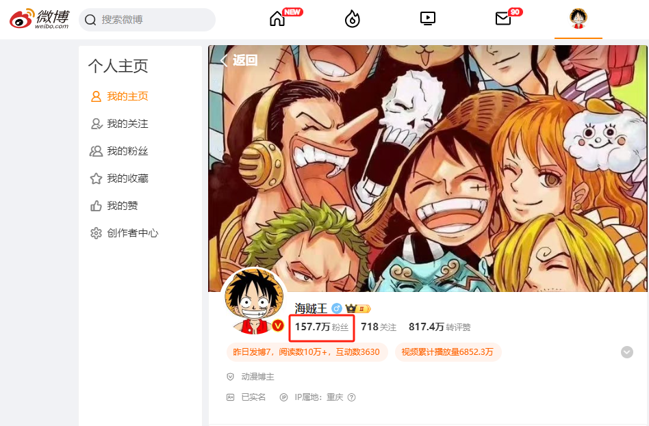 介绍:新浪微博“海贼王 ”关键词搜索第一位; 海贼王漫圈意见领袖; 粉丝活度高; 阅读量可观; 热门微博常客